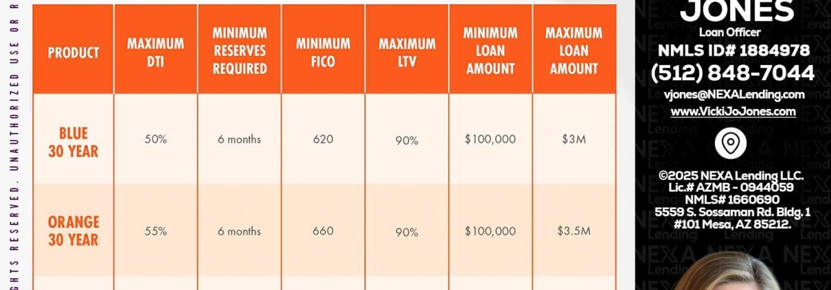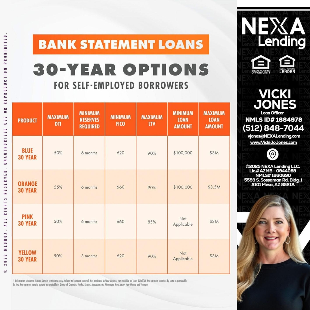 30 YEARS OPTIONS - Vicki Jones -Loan OfficerHi, my name is Vicki Jones. I’m a Loan Officer with NEXA Lending LLC., offering personalized mortgage solutions, fast customized quotes, great rates and service with integrity.