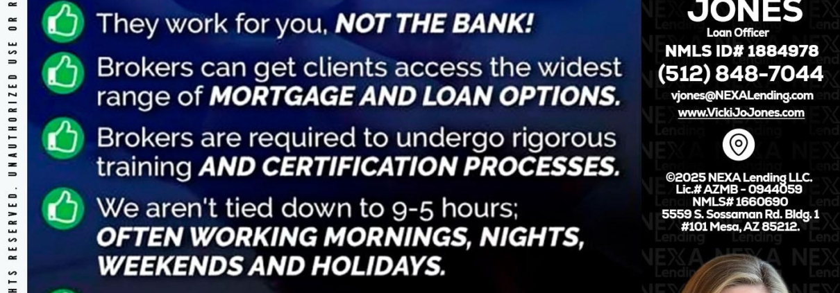 MORTGAGE BROKER - Vicki Jones -Loan OfficerHi, my name is Vicki Jones. I’m a Loan Officer with NEXA Lending LLC., offering personalized mortgage solutions, fast customized quotes, great rates and service with integrity.