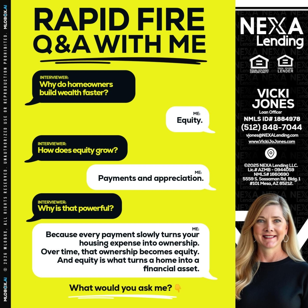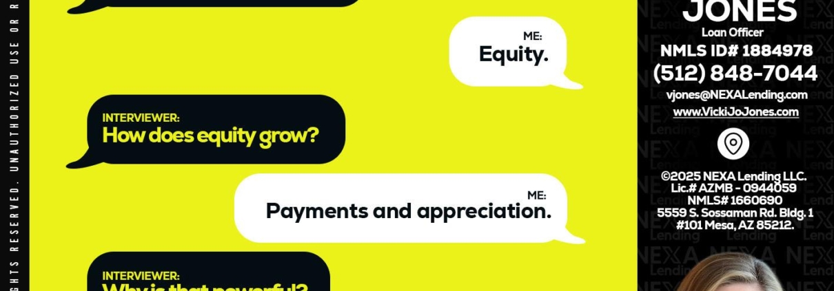 Hi, my name is Vicki Jones. I’m a Loan Officer with NEXA Lending LLC., offering personalized mortgage solutions, fast customized quotes, great rates and service with integrity.