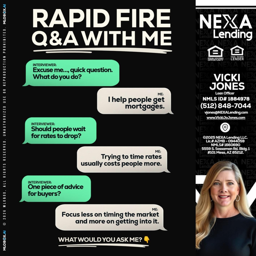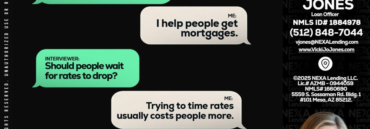 Hi, my name is Vicki Jones. I’m a Loan Officer with NEXA Lending LLC., offering personalized mortgage solutions, fast customized quotes, great rates and service with integrity.