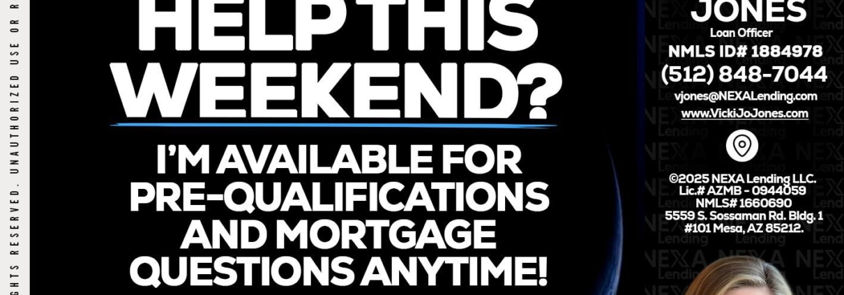 Hi, my name is Vicki Jones. I’m a Loan Officer with NEXA Lending LLC., offering personalized mortgage solutions, fast customized quotes, great rates and service with integrity.