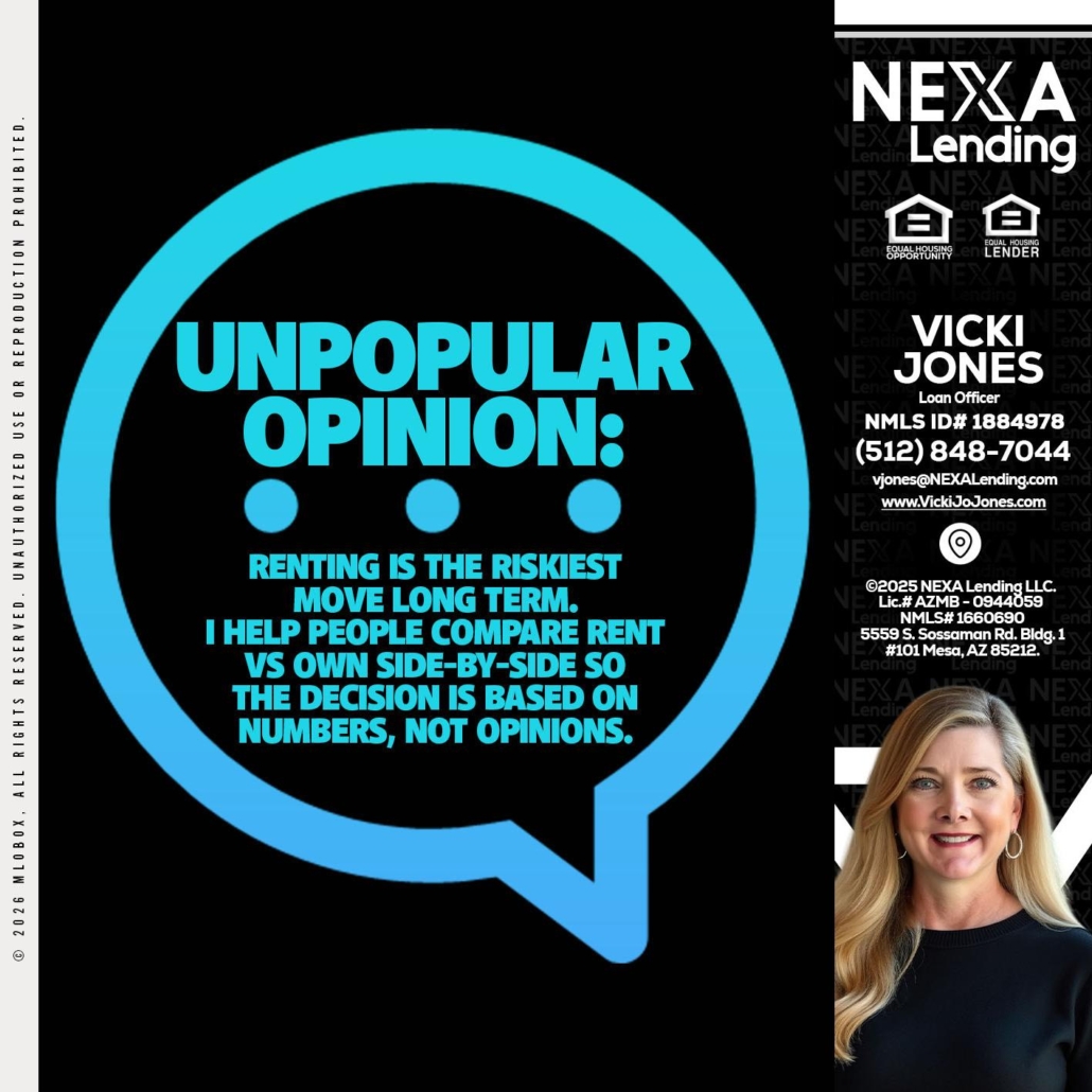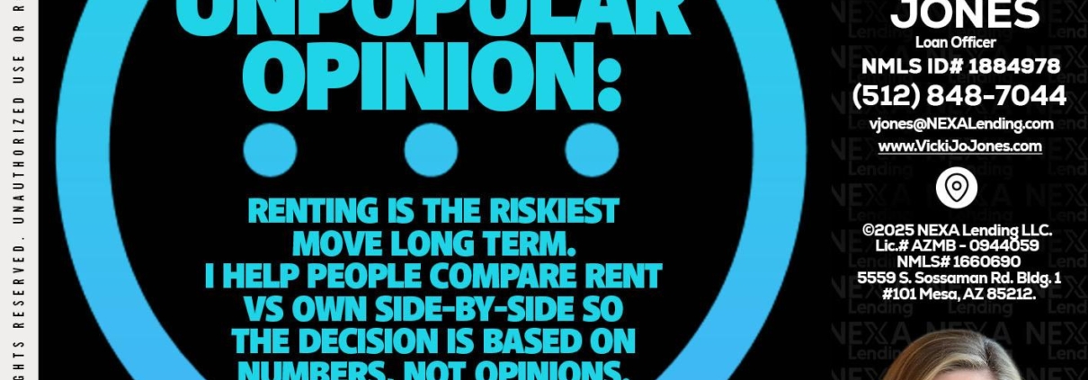 unpopular opinion - Vicki Jones -Loan OfficerHi, my name is Vicki Jones. I’m a Loan Officer with NEXA Lending LLC., offering personalized mortgage solutions, fast customized quotes, great rates and service with integrity.